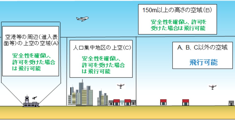 そこで、航空法は、①空港等の周辺の上空の空域、②150m以上の高さの空域、③人口集中地区の上空を規制対象とし、これらの空域でドローンを飛行させる場合には、国土交通大臣の許可を要すると定めました。