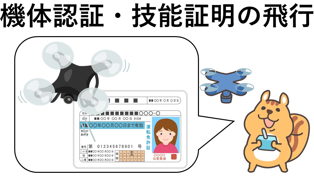 なお、立入管理措置を講ずることなく無人航空機を飛行させるときは、一等無人航空機操縦士の技能認証を受けた者が第一種機体認証を受けた無人航空機を飛行させる場合に限る(航空法第132条の86第2項)。