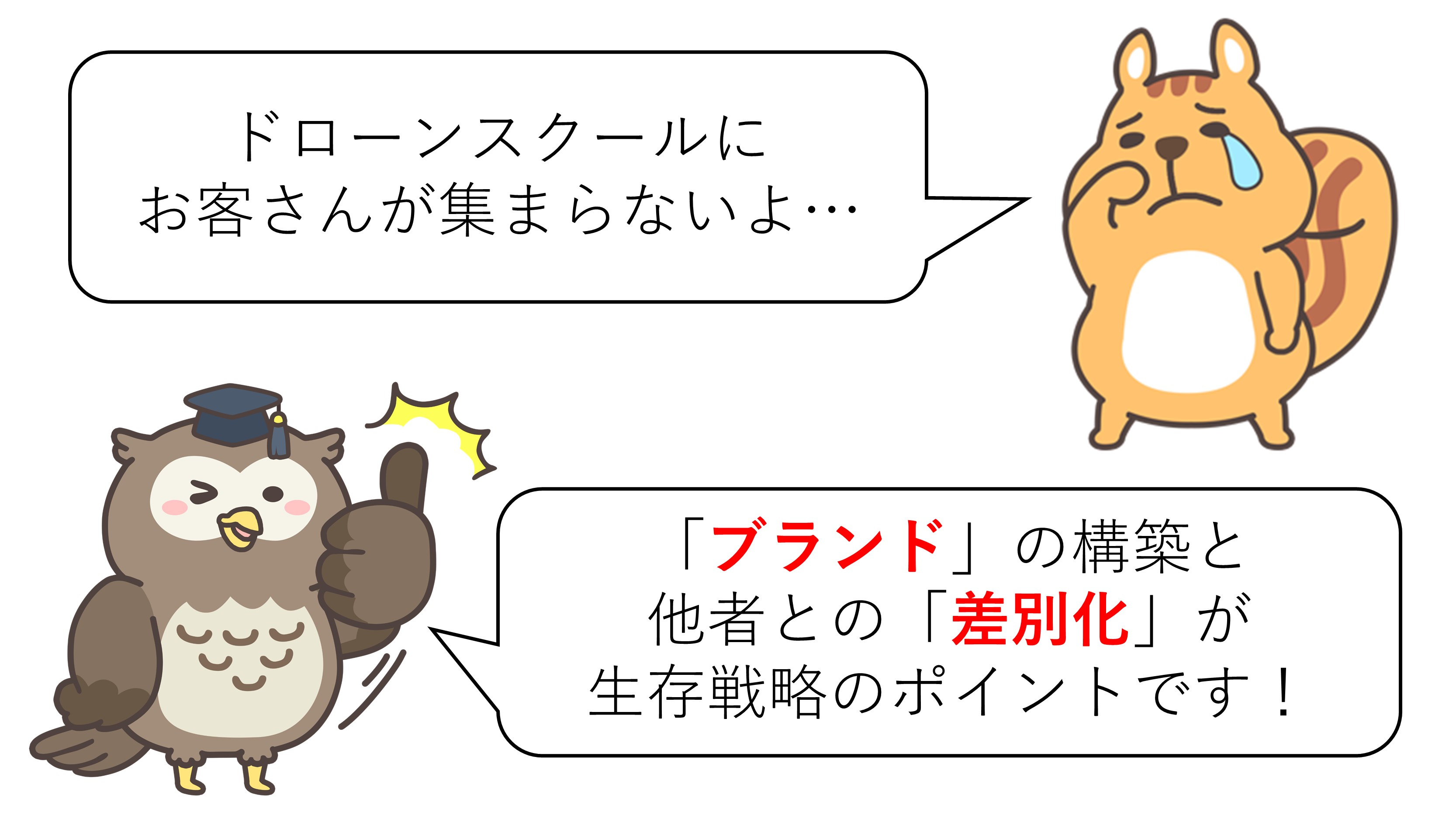 そのため、ドローンスクールの生存戦略として、過当競争でも生き残れる、「ブランド」の構築と他者との「差別化」が課題となります。