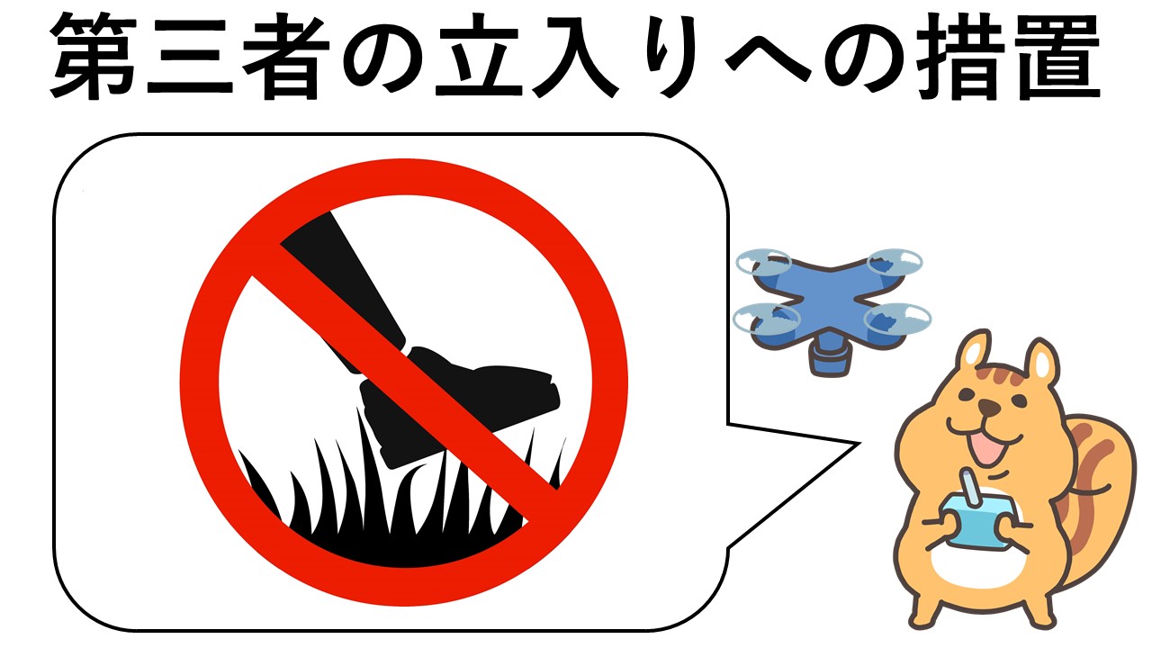 無人航空機を飛行させる者は、立入管理措置を講じることなく特定飛行を行う場合において、特定飛行中の無人航空機の下に人の立ち入り又はその恐れのあることを確認したときは、直ちに無人航空機の飛行を停止し、飛行経路の変更、航空機の航行の安全並びに地上及び水上の人及び物件の安全を損なうおそれがない場所への着陸その他の必要な措置を講じなければならない。