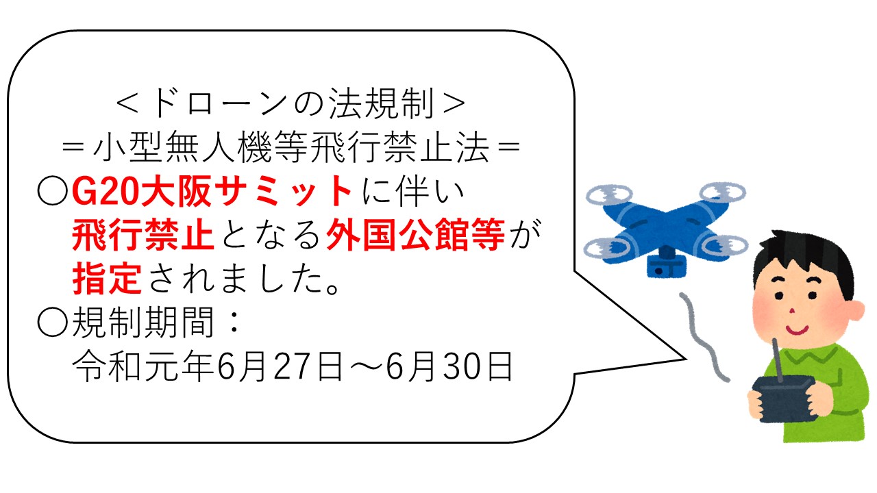 〇G20大阪サミットに伴い、小型無人機等飛行禁止法による「外国公館等」として以下の施設が指定されます。
