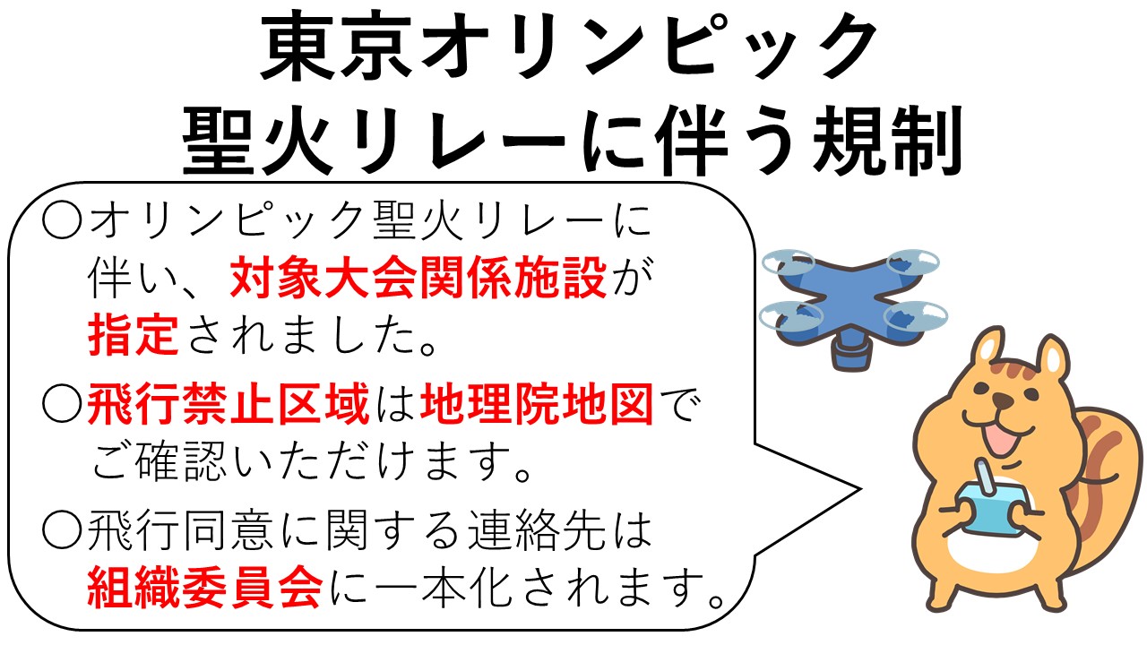 警察庁より、飛行禁止区域外の関係地域上空においても、聖火リレー実施日における聖火リレー通過市区町村においては、無人航空機の飛行を自粛していただきたい旨の要請がなされています。