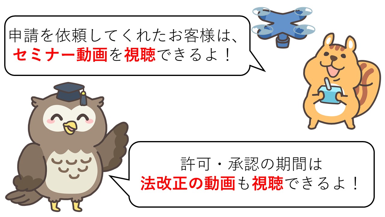 弊所にドローンの許可・承認の申請または補助金の申請を依頼されたお客様へ、ドローンの法規制を解説する弊所のセミナー動画無料で視聴できるサービスをご提供いたします。
