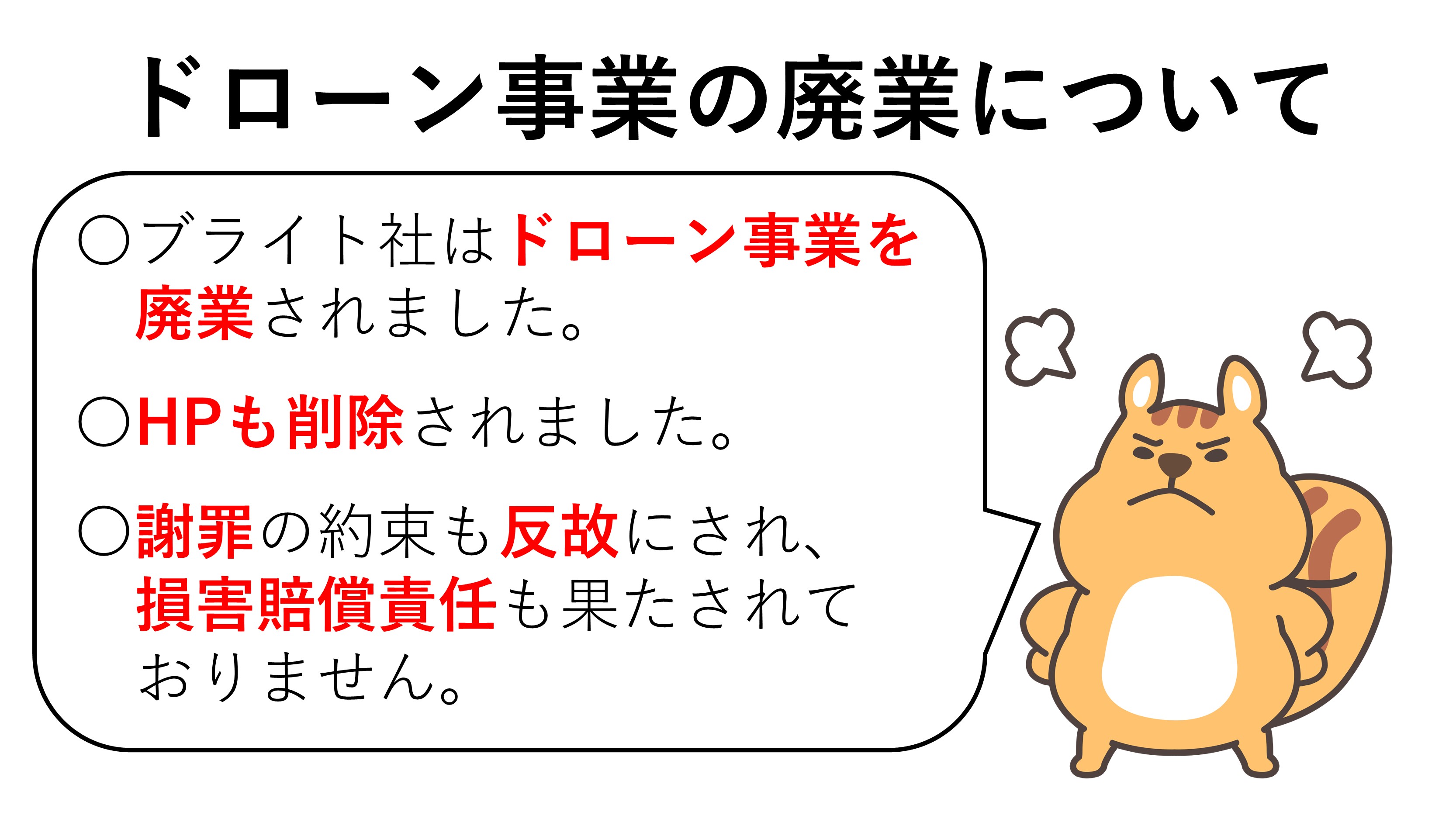 〇ブライト社は、ドローン事業を廃業(別の会社へ全て譲渡)されました。