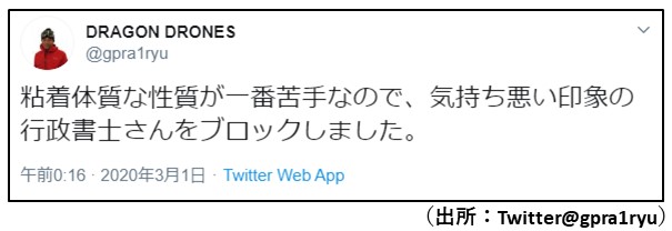 橋本氏(JUIDA認定講師、DRAGON DRONES/Drones Dragon運営者、自称:プロドローンインストラクター)は「粘着体質」「気持ちの悪い印象の行政書士」と誹謗中傷したうえで、弊所のツイッターアカウントをブロックしました。