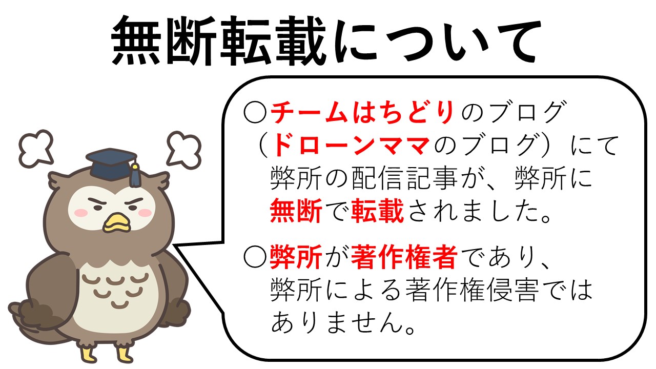 一般社団法人ドローン女性雇用促進協会(所在地:栃木県小山市大字喜沢331-2 代表:飯原夏子氏(通称:ドローンママ))が運営するドローンスクール「チームはちどり」は、弊所の配信したドローンの法規制に関する記事を、弊所に無断で、自ら運営するブログ「ドローンを片手に女性が活躍する未来を創造する“チームはちどり”」に転載しました。