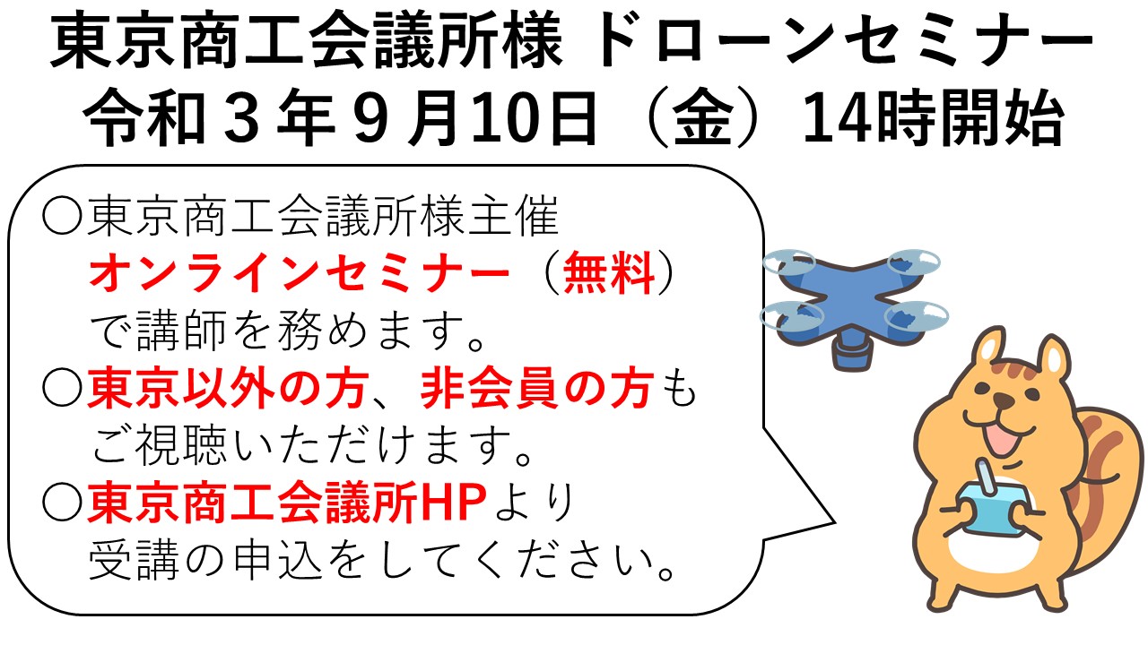 東京商工会議所様主催のオンラインセミナー「セミナーでわかる!ドローン規制の全体像~守るべきルールと活用の可能性~」に講師として登壇いたします。