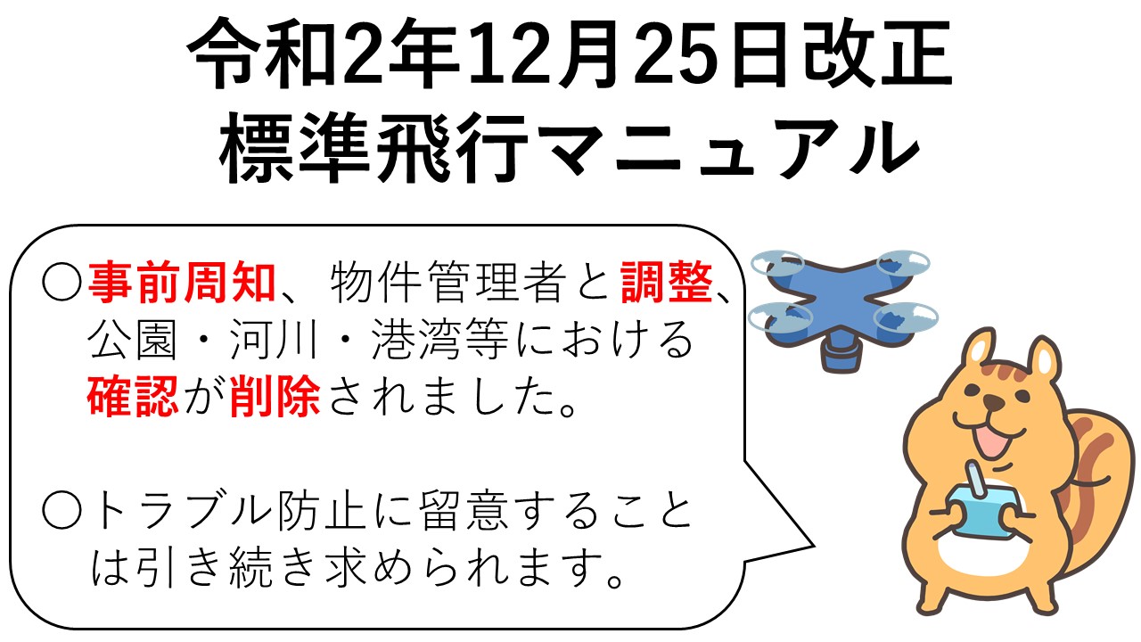 国土交通省HPでは、「本改正により飛行マニュアルから上記記載は無くなりますが、飛行経路下の住民や施設管理者等とのトラブル防止に十分に留意しながら飛行を実施頂きますよう、ご理解のほどよろしくお願いいたします。」との説明がなされています。
