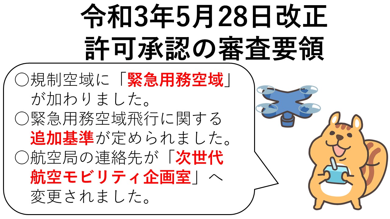 航空法施行規則の飛行禁止空域に「緊急用務空域」が追加されたことを受けて、許可・承認の審査要領も以下の点で変更がなされました。