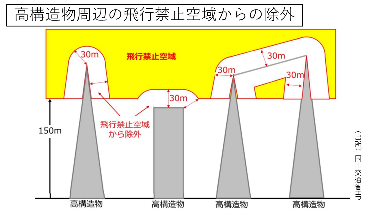 高構造物から30m以内の空域については、地表又は水面から150m以上の高さの空域であっても、国土交通大臣の許可は不要となりました(航空法施行規則第236条第1項第5号)。