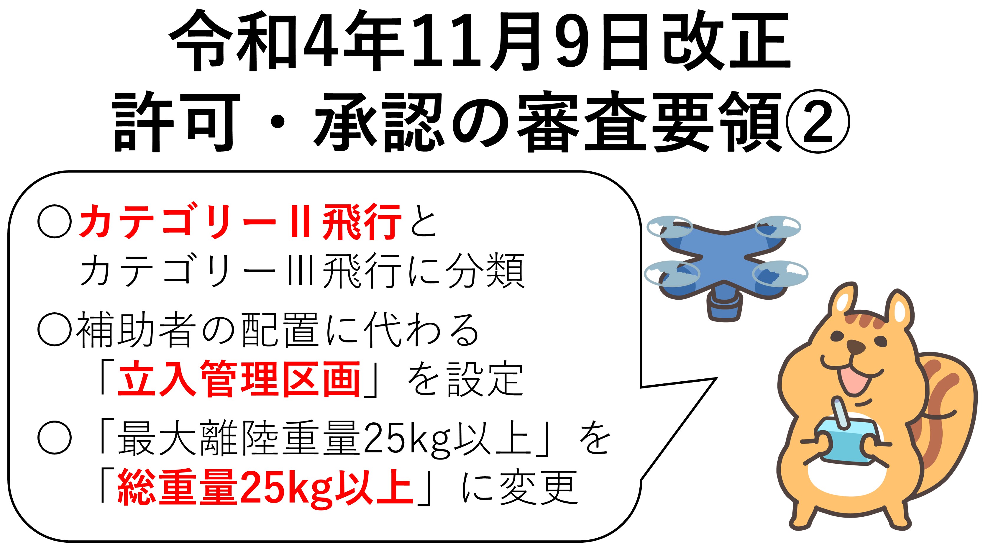 〇審査要領が「カテゴリーⅡ飛行」(立入管理措置を講じた上で行う無人航空機の飛行)と「カテゴリーⅢ飛行」(立入管理措置を講ずることなく行う無人航空機の飛行)に分かれました。