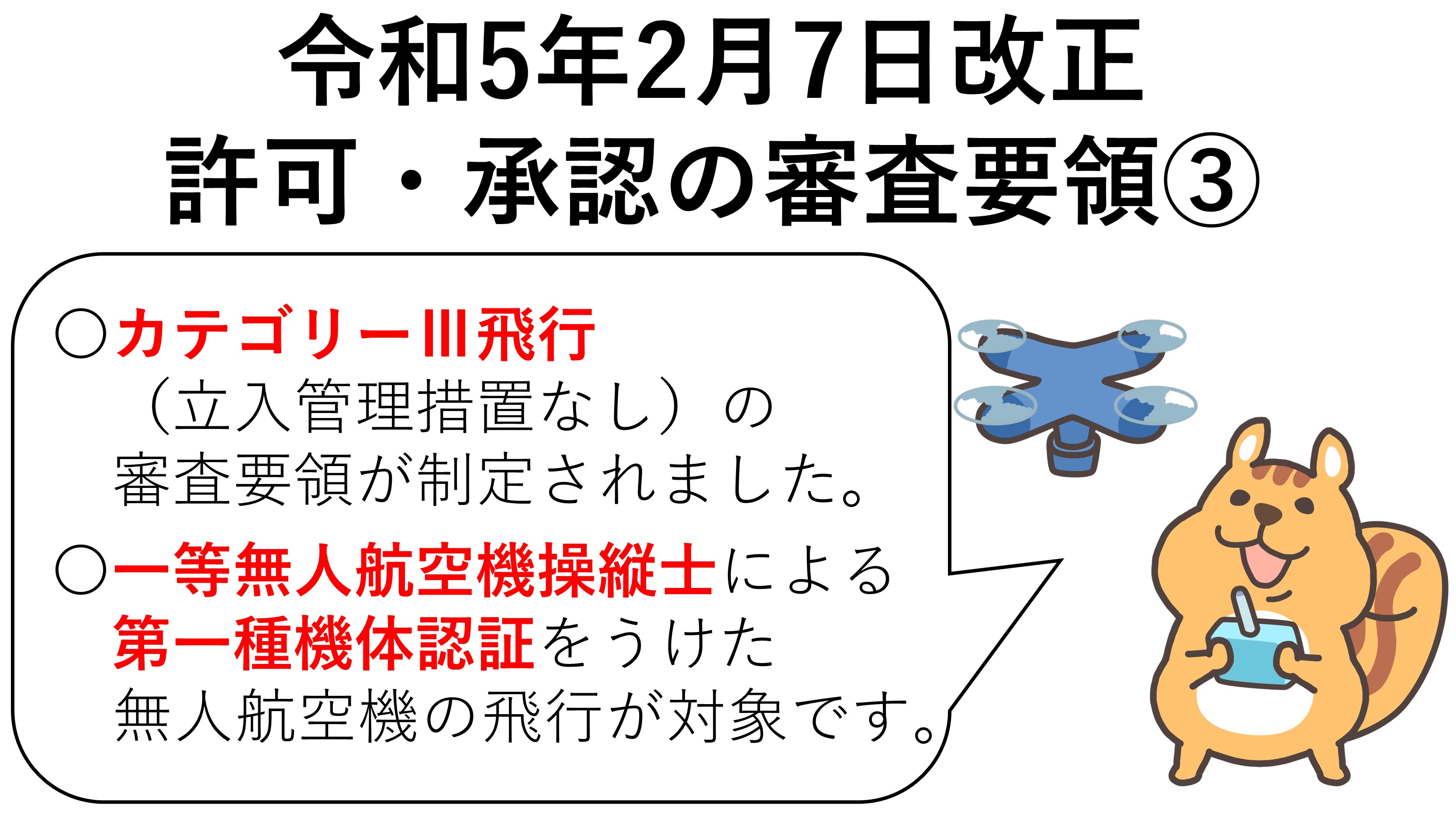 〇カテゴリーⅢ飛行(立入管理措置を講ずることなく行う無人航空機の飛行)について、審査要領が制定されました。