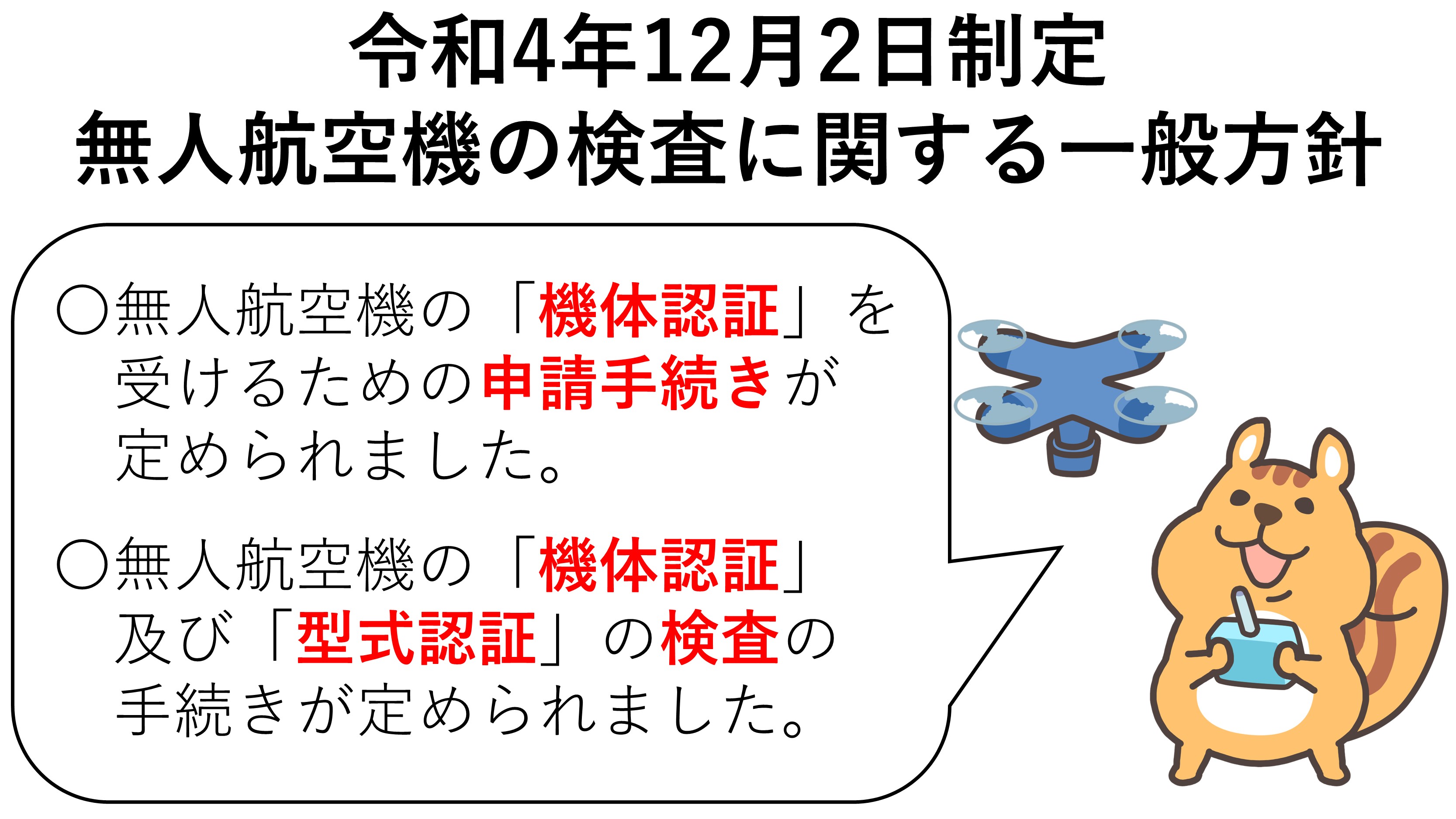 「無人航空機の検査に関する一般方針」は、機体認証を受けるための申請手続きや検査の手続きについて定めた内容となります。