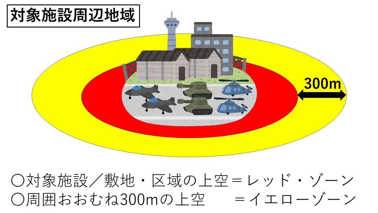 ★対象施設周辺地域のうちレッド・ゾーンを除いた周囲約300メートルの上空(イエロー・ゾーン)については、他の対象施設周辺地域と同様に①~③の飛行が認められます。