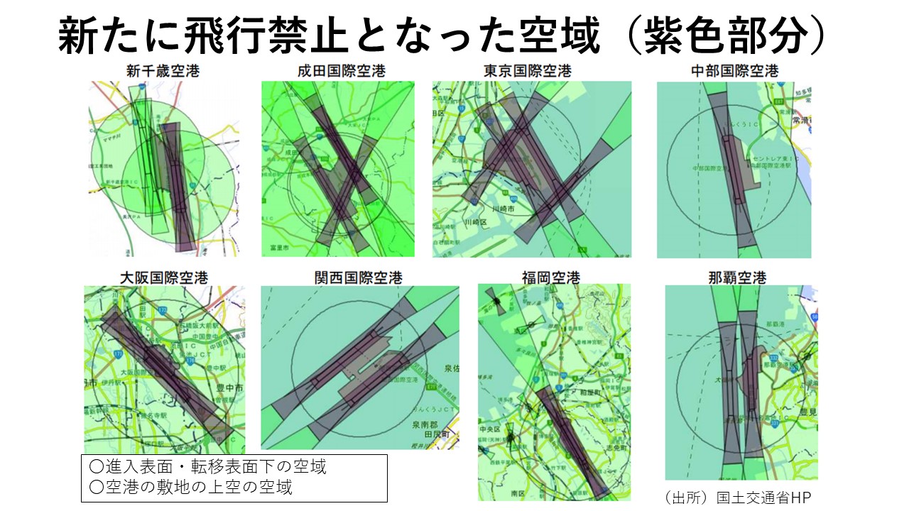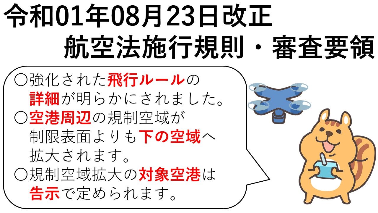 航空法改正(令和01年06月13日改正)及び上記航空法施行規則・空港周辺の規制空域の拡大を受けた記載の整除となります。