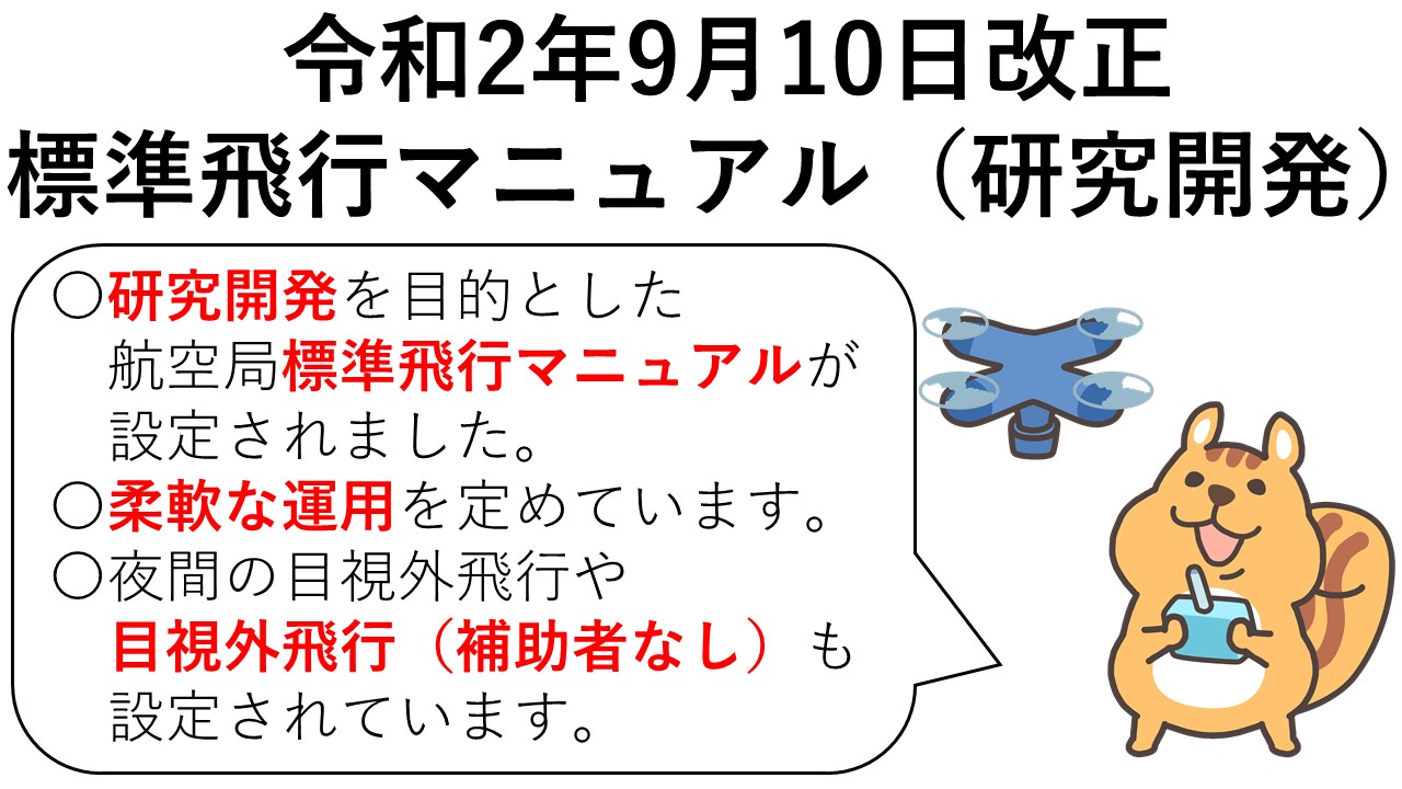 〇これに伴い、無人航空機の機体及び操縦装置の研究開発のための試験飛行を目的とした航空局標準飛行マニュアル(研究開発)が設定されました。