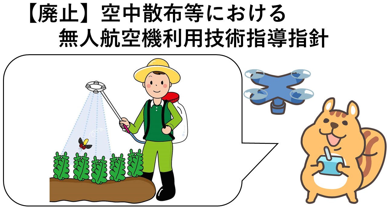 「空中散布における無人航空機利用技術指導指針」(平成27年12月3日付け 農林水産省消費・安全局長通知)(27消安第4545号)は、令和元年7月30日付で廃止されました。