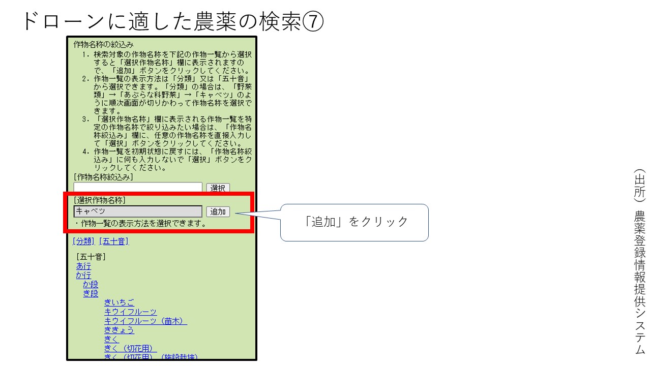4.[五十音]をクリックし、散布したい作物名を選択